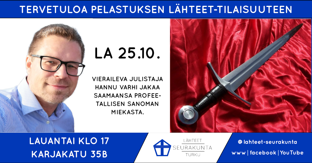 Apostolis-proteetallinen Herran palvelija Hannu Varhi tulee vieraaksemme lauantaina 25.10. Hänellä on profeetallinen sanoma mukanaan. Tervetuloa mukaan!